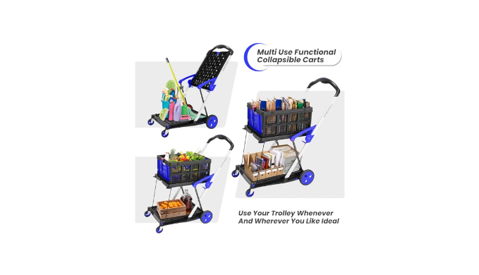 【Moving Made Simple】---- Multi use Functional Collapsible carts Can Convey Just About Anything. Using it to Loads From Supermarket, Vehicle, Apartment, Warehouse, Office, Library. Effortlessly cart taller materials such as furniture or boxes. Simply adjust the top shelf out of the way, and your grocery cart converts to a handy, high-capacity dolly!