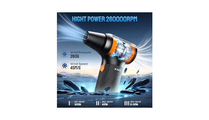 Powerful brushless motor: The compressed air duster can deliver amazing speeds up to 260,000 rpm, generating a maximum wind speed of 45 m/s and an ultra-strong wind pressure of 260g. The electric air duster can effectively remove dust and debris, and the 3 adjustable speed settings can easily adapt to various cleaning tasks
