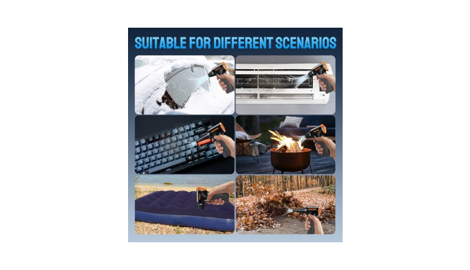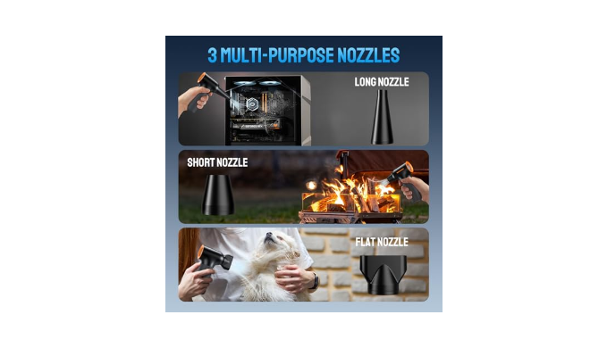 Multi-functional cleaning tool: The air duster has 3 nozzles, 1 brush, and a storage bag. The air duster is suitable for cleaning keyboards, computer hosts, air conditioning vents, car window blades, rearview mirrors, sofa crumbs, drying pet hair, barbecue, inflating, blowing snow, acting as a fan to cool down, and has become a must-have in many scenarios