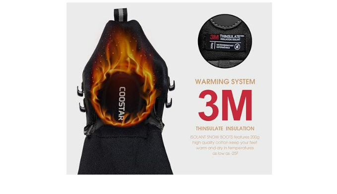 Warming System: 200g 3M Thinsulate Material is considered the warmest thin apparel insulation available. These boots will keep your feet warm and dry in temperatures as low as -25F. And means your feet will never feel the cold from the ground.