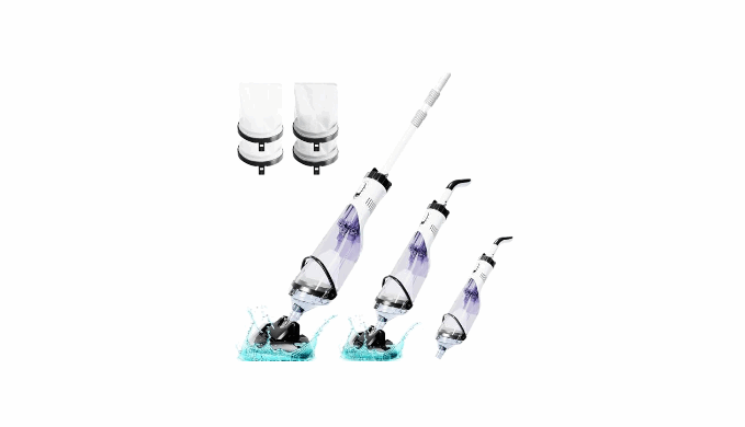 【3-step Assemble & Use】FOTING pool vacuum operates simply: attach to a handle, activate, submerge the outlet, and clean (max water temp 95℉). Features a tool-free assembly, removable filter screen, and includes 4 (0.53-gal) filter pockets, USB cable, telescopic aluminum pole, and color packaging