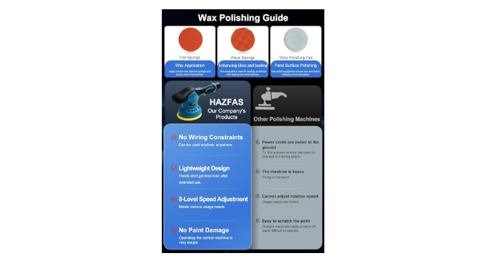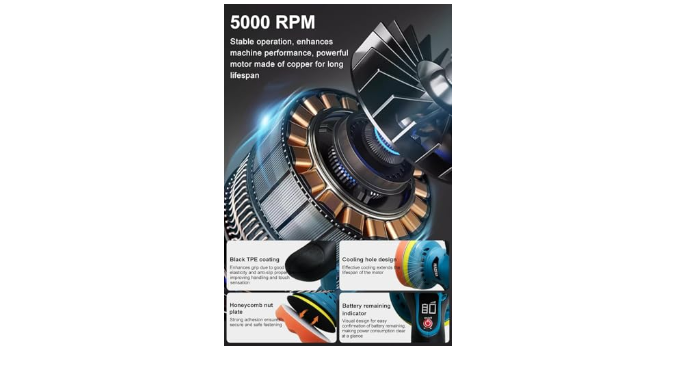 【Cordless, Lightweight, and Efficient】: This rechargeable polisher features a cordless design, liberating you from the constraints of wires. Weighing just 1043 grams, the polisher is lightweight, making it easy to operate single-handedly. Its compact design also ensures convenient storage.