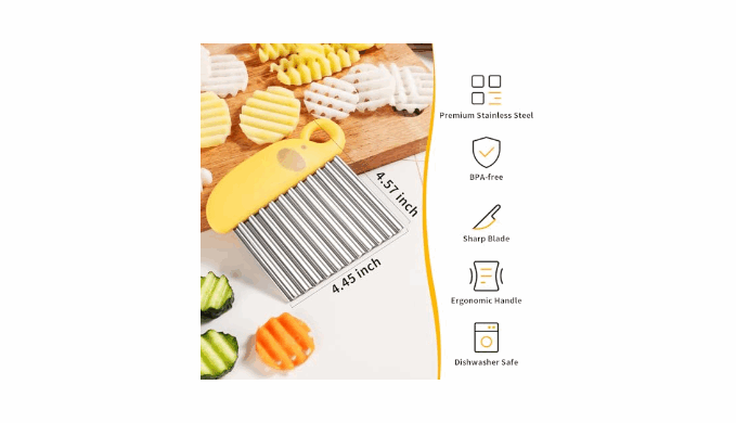 【Effortless Slicing with Sharp Wave Blade】The stainless steel crinkle cutter for veggies is ultra-sharp, featuring a 5mm-wider wave pattern that glides through tough veggies like potatoes and carrots. No need to press hard on the handle—you’ll get clean, pretty wave cuts every time, making this french fry cutter for potatoes way easier to use than a mandoline slicer.