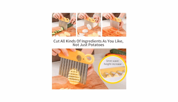 【Multifunctional Kitchen Must-Have】This crinkle cut fries isn’t just for veggies: it creates elegant wavy edges and waffle patterns on potatoes, onions, and carrots, slices fruits like apples and tomatoes, and even scrapes or divides bread dough. Whether you’re prepping snacks or meals, this stainless steel wavy cutter is your go-to tool.