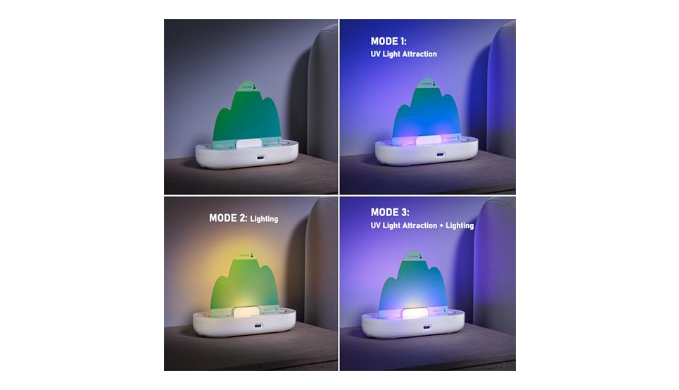 Three Lighting Modes: Our gnat trap offers three lighting modes. Mode A utilizes 395nm UV light to attract and trap insects on the sticky board. Mode B emits yellow light to lure and capture insects, doubling as a night light. Mode C combines UV and yellow light for dual attraction.