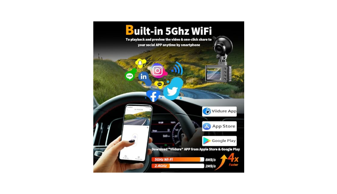 5GHz WiFi & Smart App Control: Easily connect the A13 front and rear dash cam to your smartphone via WiFi and control everything through the \"Viidure\" app. Compatible with both iOS and Android, this dash cam allows you to view, playback, and download recordings seamlessly. With 5GHz WiFi, enjoy fast video transfers from the dual dash cam. The app also enables one-click sharing of your footage, making it perfect for reliving and sharing memorable drives