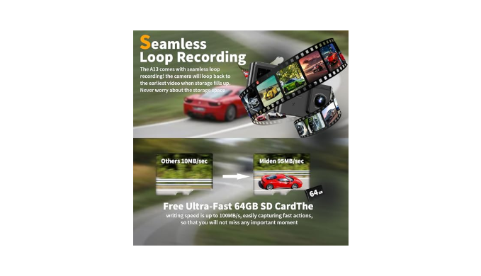 Loop Recording & 64GB SD Card:The WANLIPO A13 front and rear dash cam features intelligent loop recording, ensuring you never miss a moment, as it automatically overwrites the oldest files when storage is full. This dual dash cam comes with a 64GB SD card, allowing you to start recording immediately and continuously without worrying about running out of space. Equipped with a premium F1.6 aperture and a 6-layer optical lens, this dash cam\'s WDR technology enhances clarity in low-light conditions