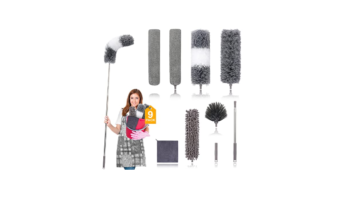 【Upgraded 9 Pcs Dusters Kit】: This multifunction dusters for cleaning kit includes a extendable long pole and a mini pole, 2 bendable microfiber duster head,1 chenille duster head, 1crevice brush, 2 flat brush dust cloth, 1cobweb duster head. Replacing different types of duster brush heads which can easily allows you to clean hard-reach any places, contains everything you will need to clean your home from floor to ceiling, keeping your home away from dust.