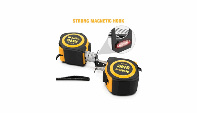 2. **Automatic locking function**: The tape measure is equipped with a convenient automatic locking mechanism that allows the user to easily lock the desired length while measuring without worrying about the tape measure slipping or bouncing back. Simply press the release button and the tape measure is automatically rewound, eliminating the hassle of manual retrieval.
