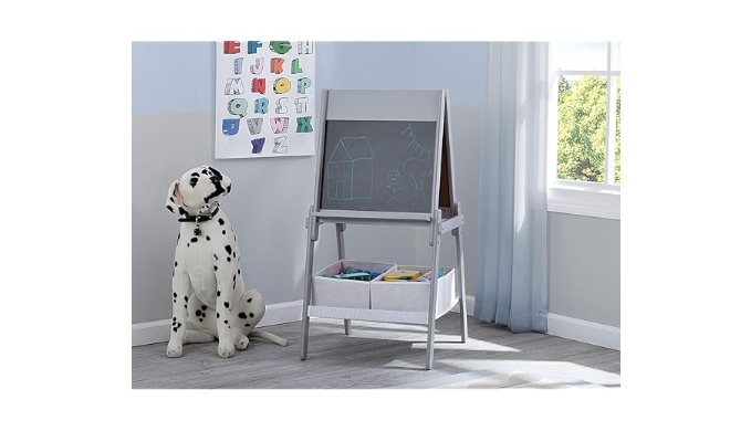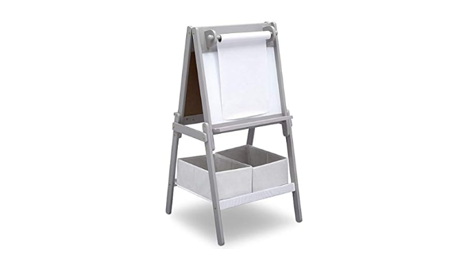 Spark artistic play with the MySize Double-Sided Storage Easel from Delta Children. This two-sided easel for kids features three different drawing surfaces-a chalkboard on one side, a magnetic dry-erase whiteboard on the other, and a pull down paper roll on top (33 feet of paper included). Just the right height for growing artists, this kids easel encourages creativity and allows little ones to develop their fine motor skills through painting, drawing, coloring and writing. Two storage bins underneath the easel keep art supplies neat and nearby. Available in a number of beautiful colors: Grey, Bianca White or Dark Chocolate. Coordinates with other items in the MySize Collection from Delta Children. Delta Children was founded around the idea of making safe, high-quality children\'s furniture affordable for all families. They know there\'s nothing more important than safety when it comes your child\'s space. That\'s why all Delta Children products are built with long-lasing materials to ensure they stand up to years of jumping and playing. Plus, they are rigorously tested to meet or exceed all industry safety standards. This two-sided easel features a chalkboard side and a magnetic, dry-erase whiteboard side.