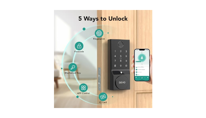 【5 Ways to Unlock】Devo G2 smart lock provides 5 ways to Unlock. AI Fingerprint + App Control + IC Card + Passcode + Physical Key. Provide you with a convenient and safe home door lock solution.