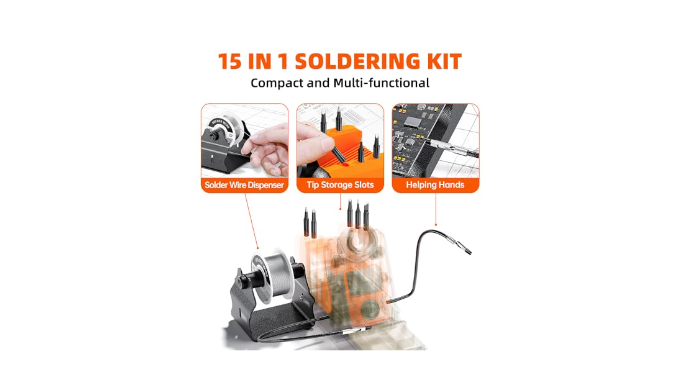 This 12-in-1 soldering iron kit includes the MEAKEST Soldering Station, 2 Helping Hands, 6 Soldering Tips, a Roll of Lead-free Solder Wire (35g), a Solder Sucker, ESD Safe Tweezers, a Solder Wire Dispenser, and a Cleaning Sponge.