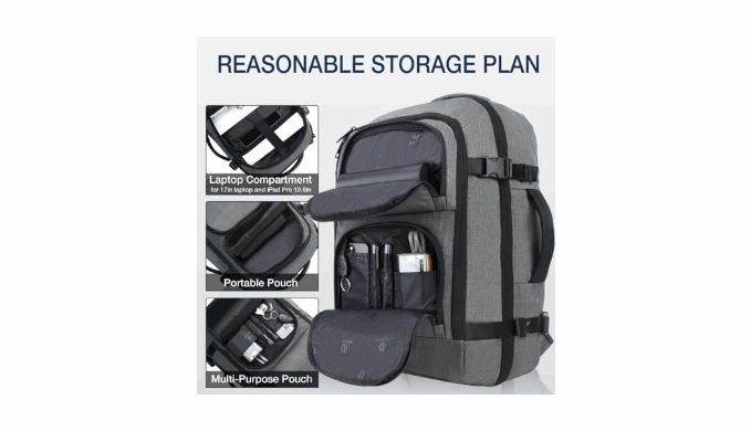 ✈Well-Partitioned Storage:Two front pockets, side pockets and a 17-inch laptop pocket with foam padding, and a main compartment with mesh pockets and luggage compression straps to keep your travel gear organized and easier to find.