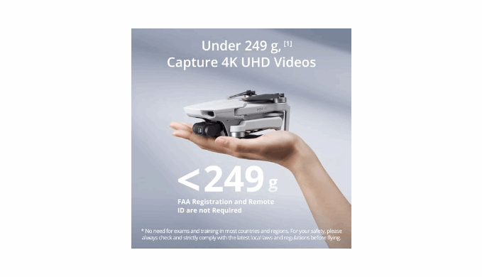 No Registration Needed - Under 249 g, FAA Registration and Remote ID are not required if you fly for recreational purposes. Visit the FAA\'s official website for requirements related to drone registration and Remote ID. [1]