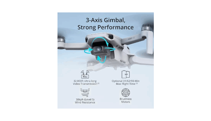 38kph (Level 5) Wind Resistant - DJI Mini 4K has a stable flight even in Level 5 winds. Brushless motors enhance power and allow takeoff at altitudes up to 4,000 meters.