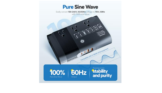 100% Pure Sine Wave 500W Max Voltage Converter: Our 350-watt power converter is equipped with three standard AC outlets, two USB-A ports, and two USB-C ports, allowing you to charge multiple devices at once. It\'s compatible with American hair straighteners and curling irons up to 500 watts and supports other electronics under 350 watts, such as hair clippers, electric shavers, toothbrushes, flossers, beard trimmers, laptops, breast pumps, nebulizers, CPAP machines, gaming consoles like Xbox, tablets, TVs, and more.