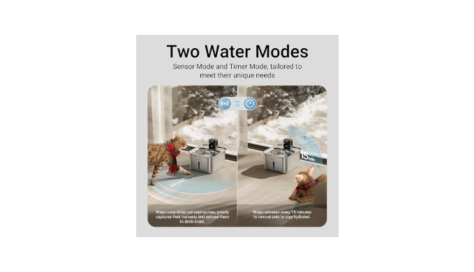 Pet-Friendly Smart Fountain: Designed for cats’ love of flowing water, this cat drinking fountain mimics a natural faucet stream to encourage hydration. With smart motion detection (5ft/1.5m range, 120° angle) and timed cycles (20s every 15min), it automatically engages your cat’s curiosity. Unlike traditional water bowls, this water fountain for cats encourages cats to drink more independently, promoting urinary tract health