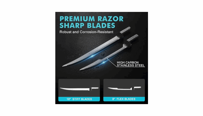 Two Blades, More Versatility - Including both an 8\" flex blade and a 10\" stiff blade, this battery operated fillet knife gives you unmatched versatility for various tasks. Crafted from premium carbon stainless steel, both blades stay sharp and strong whether you’re filleting snapper, cod, flounder, tuna, swordfish, halibut, salmon, or ocean perch