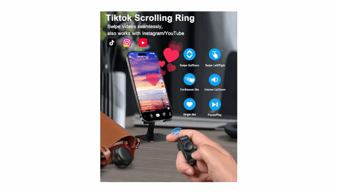 TikTok Scrolling Ring: Enjoy a truly hands-free TikTok experience. Effortlessly scroll up and down, left and right, pause/play, like/continuously like, and adjust the volume—all without touching your phone screen. Experience smooth control for uninterrupted video watching