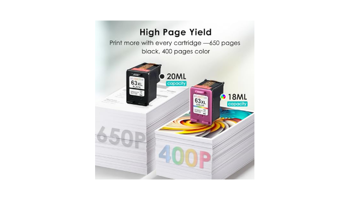 High Yield: EcoVictor for hp ink 63xl black and color combo pack page yield is up to 650 pages per 63xl black ink cartridge, and 400 pages per 63xl color ink cartridges (depends on printer and usage).