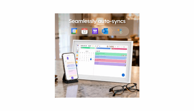 Easy Setup and Stay Connected: Easily mountable or desktop-ready. Connect to the Aimor app for remote schedule/chore syncing, photo sharing, and real-time updates to keep your family’s daily life organized and connected