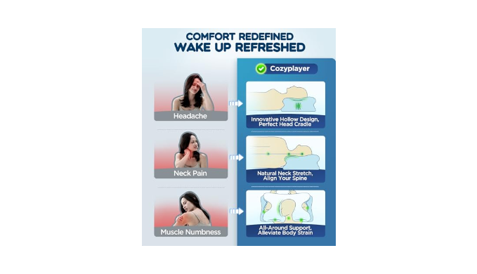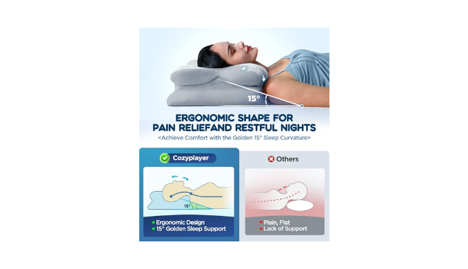 DISCOVER THE COMFORT OF PAIN-FREE SLEEP WITH MULTI-ZONE SUPPORT - Cozyplayer\'s patented ergonomic pillow stands apart from traditional contour pillows, offering upgraded contour zones that conform to the body\'s natural curves with a remarkable 95% accuracy. The distinctive contour zones target pressure points, offering perfect support for your neck, shoulders, head, and arms. In as little as two weeks, you\'ll feel the relief from neck pain, making pain-free sleep an effortless part of your life.