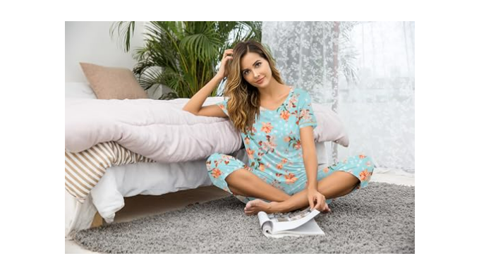 【Feature】Comfort and style come together perfectly with this pjs that has contrast color trimmed at the hem, cuff. Each sleepwear set includes a short-sleeved v neck pullover and a pair of capri pants for comfort. And the pant is designed with an elastic waistband.