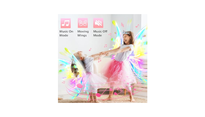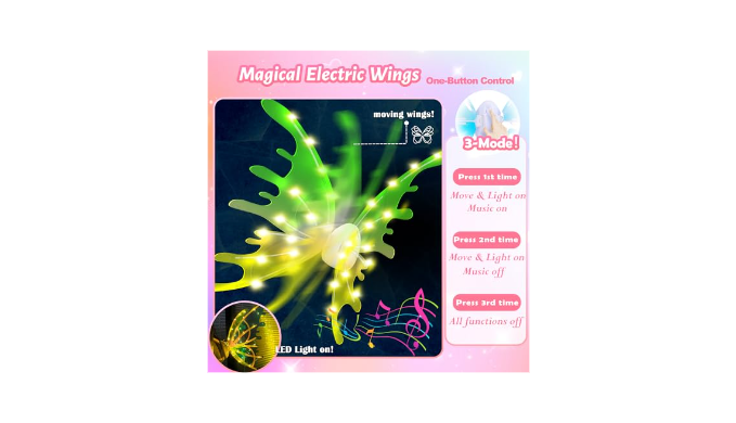 【Multi-Functional Electric Wings】Titoclar butterfly wings can light up, moving, and play joyful music - just hit the button to start all functions. (The music can be turned off independently, while the wings continue moving and the LED lights remain on) Transform your little girl into a beautiful fairy or butterfly with the magical light-up and moving wings, making them the most shining stars of the night!