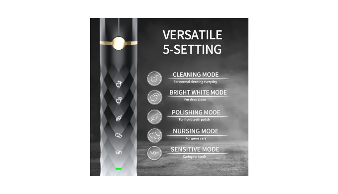 【Versatile 5Mode Design】This electric toothbrush offers users an even more versatile and customizable cleaning experience.The 9 core modes, , allow users to precisely target their specific oral health requirements, whether it\'s thorough cleaning, whitening, gum care, or gentle sensitivity-focused brushing. This level of personalization further enhances the product\'s ability to deliver exceptional cleaning results tailored to individual user needs.
