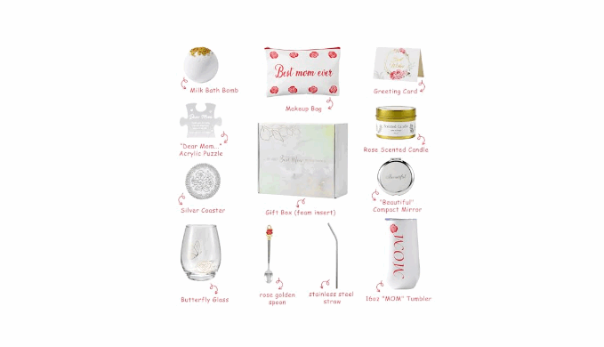 12pcs: This gifts basket for mom includes 1x \"MOM\" 16oz tumbler, 1x Stainless Steel Straw, 1x Butterfly Glass, 1x Rose Spoon, 1x \"Dear Mom\"Acrylic Puzzle, 1x Silver Coaster, 1x \"Best Mom Ever\" Makeup Bag, 1x \"beautiful\" Mirror, 1x Scented Candle, 1x Milk Bath Bomb, 1x Greeting Card, 1x Gift Box. Each item sits securely in the box and is ready to be gifted!
