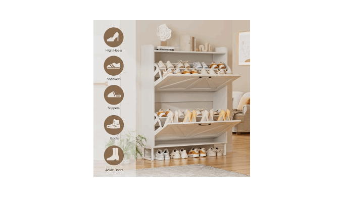 【Spacious Storage】 This multifunctional shoe cabinet offers a large capacity for 20-24 pairs of shoes, equipped with two flip-top drawers with flexible and adjustable layers. It easily accommodates flats, high heels, mid-calf boots, and slippers can be stored at the bottom, meeting the storage needs of the whole family.