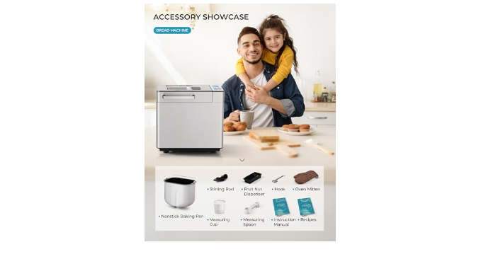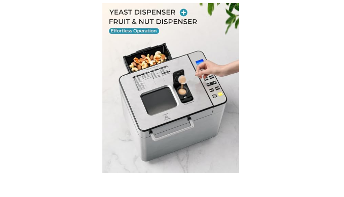 【Innovative Fruit & Nut and Yeast Dispensers】Elevate your baking experience with our upgraded bread maker machine, now featuring both Fruit & Nut Dispenser and Yeast Dispenser. These dispensers automatically release ingredients at the optimal moment during the cycle, ensuring even distribution of fruits, nuts, and yeast throughout the dough. This can transform your homemade bread into a delightful treat for family and friends. It\'s a thoughtful addition that makes for a truly heartwarming gift, enhancing both the taste and quality of your bread