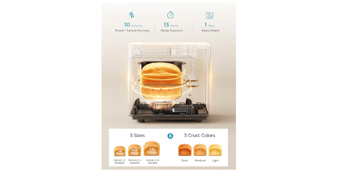 【Large Capacity & User-Centric Design】With our Euhomy professional bread machine maker, you are able to customize your loaf with 3 crust colors ( light, medium, dark ) and 3 sizes (2lb, 1.5lb, 1lb).The stainless steel sheel keeps you away the worries of rust. Our automatic bread maker\'s viewing window allows you to enjoy the show of a small bread maker. Also the thoughtful design of insulated handle makes it safe for you to open the bread machine, and you just need to turn and lift the pan to remove it, making it suitable to be a family\'s gift