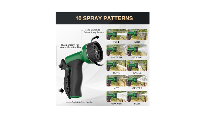 10 Patterns of Spray Nozzle: Our garden hose nozzle offers 10 spray patterns to meet all your watering and cleaning needs, from watering crops and flowers to bathing pets and cleaning cars, pools, RVs, windows, and more.