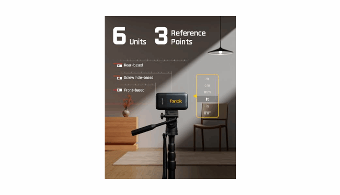 6 Units + 3 Modes + 3 References: The A 10 Pro supports 6 units (Ft/Ft+in/in/M/CM/mm), 3 modes (distance/area/volume), and 3 reference points (front/rear/screw hole). Its tripod-compatible design ensures stable projection and high-altitude positioning, delivering precise measurements in corners, ceilings, and other complex scenarios with flexible operation