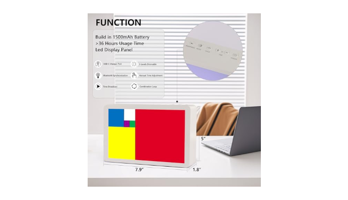 Smart Office Revolution: Bluetooth auto-syncs mobilephone time USB-C charges Voice announces time in 12hr formats 3 brightness levels for day/night use Seamlessly integrates with tech-forward spaces