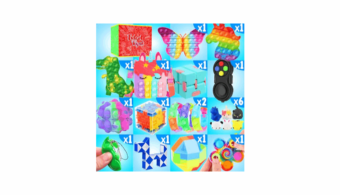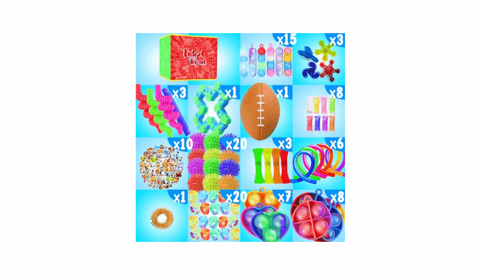 PACK OF 126: 3 Pop Bubbles, 1 Pop Purse, 6 Mochi Squishies, 6 Stretchy Strings, 3 Marble Mesh Fidget Toys, 1 Snake Cube Twist, 1 Tracks Snap, 1 Fidget Controller, 1 Infinity Cube, 2 Puzzle Boxes, 1 Squeeze Soybean, 1 Pop Fidget Spinner, 2 Pop Bracelets, 8 Foam Putty, 10 Stickers, 1 Spiky Ring, 1 Pop Ball, 20 Spiky Balls, 1 Football Foam Ball, 20 Pop Rings, 30 Mini Pop Bubbles, 3 Mini Fidget Spinners and 3 Pop Tubes