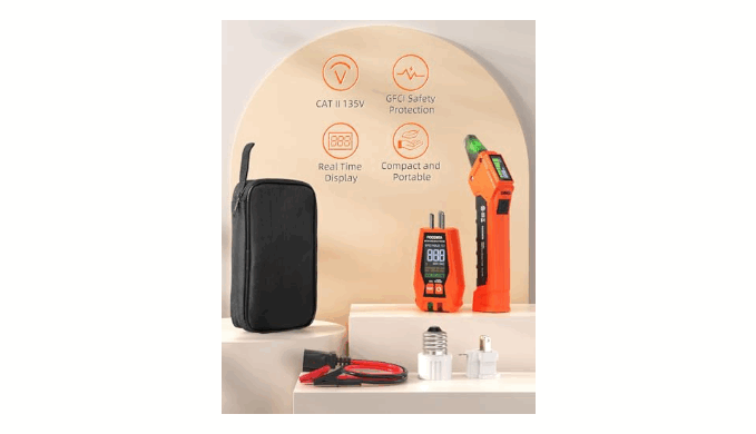 Professional-Grade GFCI Tester with Real-Time Diagnostics & Battery Backup: This advanced outlet tester verifies GFCI protection status while uniquely displaying testing duration on its large screen—a feature standard testers lack. It combines bright red/green LED indicators for instant pass/fail signals with a detailed display that diagnoses 6 common wiring faults (open circuits, reverse polarity, etc.). The built-in battery locks test data for 10 seconds during power loss, ensuring technicians never miss critical readings, while its portable design streamlines inspections in homes, commercial sites, or emergencies