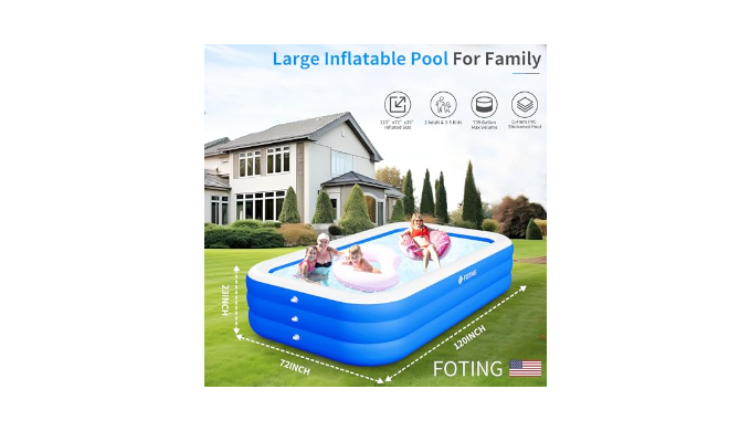 FAMILY-SIZE INFLATABLE POOL: Size: 120\" X 72\" X 23\". Max. water capacity: 739 Gallon. Big inflatable pool offers ample space, allowing 2 adults and 3-5 kids to splash and play together, creating unforgettable memories