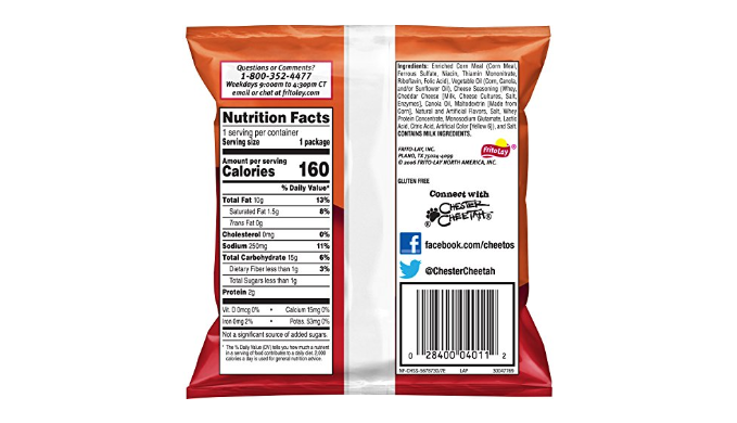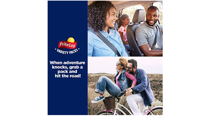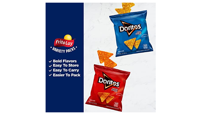 Includes (8) 1 oz bags of Doritos Nacho Cheese, (6) 1 oz bags of Doritos Cool Ranch, (4) 1 oz bags of Lay\'s Sour Cream & Onion, (4) 1 oz bags of Rold Gold Tiny Twists, (4) 0.625 oz bags of Smartfood White Cheddar Popcorn, (6) 1 oz bags of Cheetos Crunchy, (4) 0.875 oz bags of Cheetos Puffs, and (4) 1 oz bags of Sunchips Harvest Cheddar