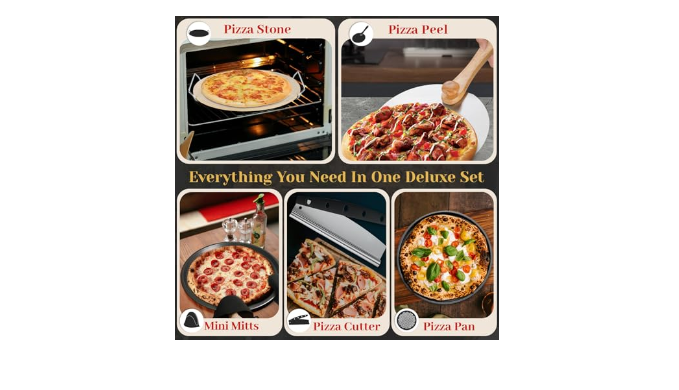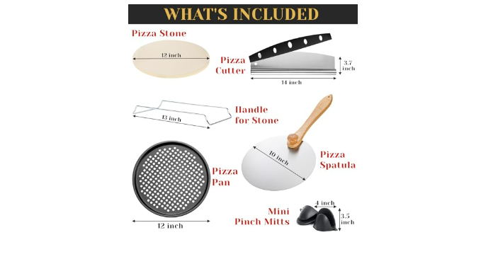【Thoughtful Accessories】The pizza stone set includes a 13-inch round pizza stone, along with a handle rack, pizza cutter, pizza peel, pizza pan, and mini oven mitts. The handle rack ensures easy handling of the hot stone, while the pizza cutter and peel allow for effortless serving. The pizza pan and mini oven mitts add convenience and safety to your baking experience