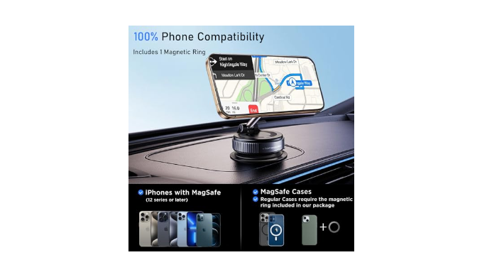 [Stronger Magnetic Force Phone Mount]: Designed with super strong magnets to ensure your phone is firmly fixed. Even on bumpy roads or during sudden stops, the car phone holder stays firmly in place. Specifically crafted for iPhone 16/15/14/13/12 Pro Max Mini and compatible with official MagSafe cases, as well as other magnetic phone cases. Attention:non-magnetic phones and cases, we provide a metal ring that works with all Android devices. Simply attach the metal ring to the back of your phone or case and let it sit for 24 hours to maximize adhesion strength.