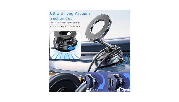 [How to Install on Non-smooth Surfaces]: If mounting on grainy, uneven, or non-smooth surfaces (e.g. textured dashboards), please use the included base mounting pad to ensure perfect suction: ①Make sure the surface is clean and dry & peel pad\'s red protective film; ②Press firmly for at least 10s and allow 24 hours for adhesion before use; ③Attach vacuum suction cup to the pad\'s center and lock. The pad creates an ultra-smooth base, making the vacuum phone mount\'s suction rock-solid grip. [360° Rotation & 180° Dual-Axis Adjustment]: The vacuum magnetic phone holder features a 360° rotating rod and 180° dual-axis folding metal arm, easily adjust the angle to suit your needs.