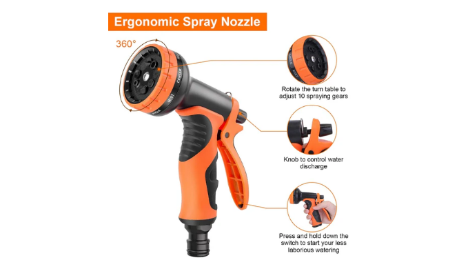 - Ergonomic Spray Nozzle: Featured with ergonomic structure, we can simply press and hold down the switch on the spray nozzle, which makes grass or flower watering easier.