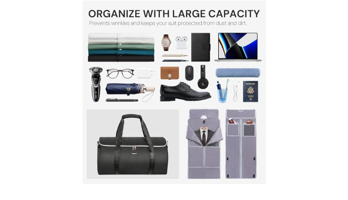 Various Ways to Carry: This travel garment bag offers four carrying options: shoulder, hand, crossbody, or placed on your suitcase, making it easy to store and carry. The convertible garment duffel bag includes a zippered pocket for easy access to your smartphone, ID, or passport. This convertible garment bag for travel is designed for maximum convenience and versatility, offering added flexibility for your travel.