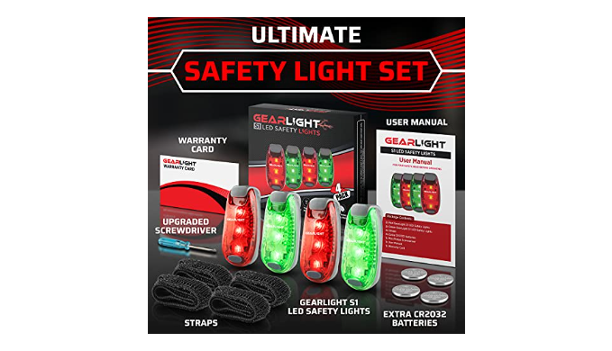 Excellent 4-Pack Value + Extra Bonuses: Includes 2x Red + 2x Green GearLight S1 Safety Lights with batteries preinstalled. You also get 4x extra CR2032 batteries (2 sets), 4x straps, and a mini screwdriver for easy battery replacement.