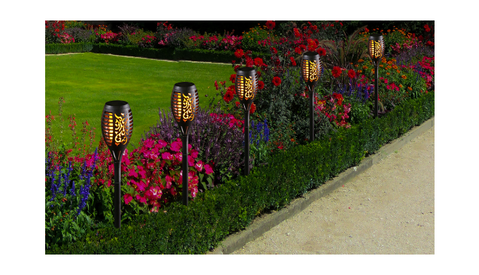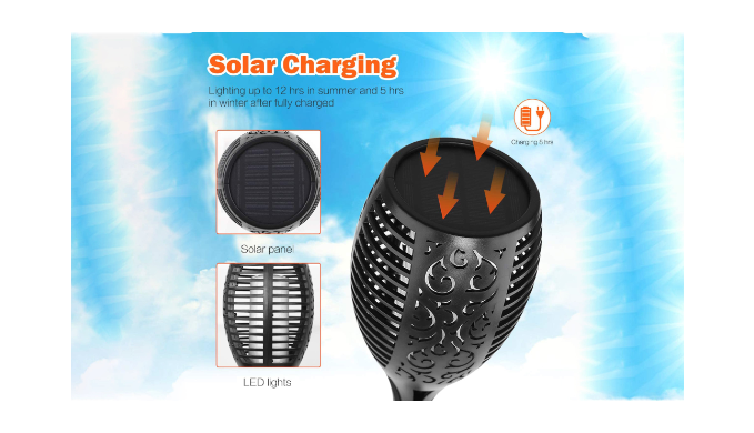Solar-powered garden lights: no wires or electricity needed. Charges by day, auto-illuminates by night. IP65 waterproof, durable for year-round use. Provides 6-8 hours of warm, flickering light resembling tiki torches, perfect for gardens, paths, porches, or camping.