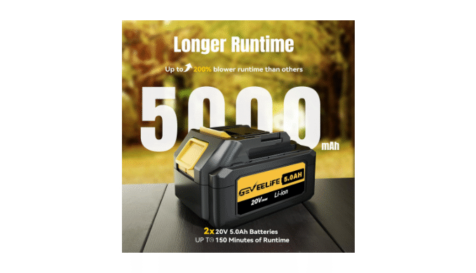Upgrade to 2 Batteries & Fast Charging: Electric Cordless Leaf Blower comes with two 20V-5.0Ah batteries and a charger, runs up to 150 minutes on low-speed mode. (Note: The battery is not compatible with DEWALT.)