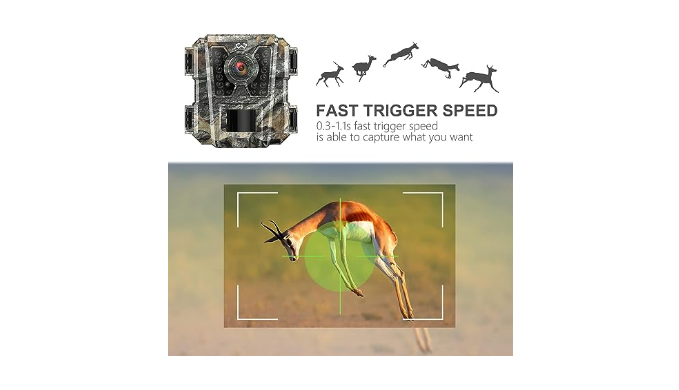 Faster Trigger Speed: This hunting camera has a detection range of up to 65 feet. The fast PIR motion sensor has a trigger time of 0.3s~0.6s and adjustable sensitivity.