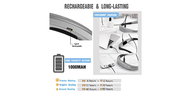 [Rechargeable & Long-Lasting] This neck reading light rechargeable with USB Type-C which is reversible and therefore easier to plug in compared with other neck lights for crafts charged with Micro-USB. Up to 80 hours (general reading, single head) of powerful, non-diminishing brightness from the included premium rechargeable 1000mAh battery. A long lasting usb rechargeable book light for reading in bed.